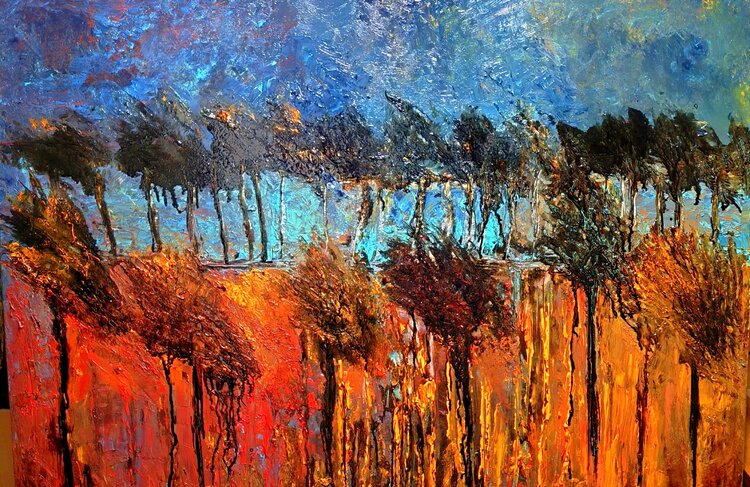 In diesem Werk habe ich versucht, die lebendige Energie der Natur und ihre kraftvolle Ruhe einzufangen. Durch den kühnen Einsatz von Acrylfarben, abstrakte Pinselstriche und ein intensives Farbenspiel erwecke ich einen beinahe mystischen Wald zum Leben, in dem jedes Element seine eigene Energie ausstrahlt. Die Palette aus Blau- und Rottönen vor dem Hintergrund erdiger Nuancen unterstreicht nicht nur die natürliche Schönheit, sondern weckt auch ein… Gefühl des Staunens und unendlicher Möglichkeiten und schafft so einen visuellen Rückzugsort in jedem Raum, in dem das Bild ausgestellt wird.