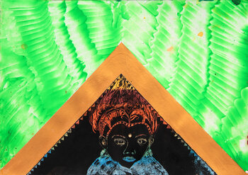 Meine Arbeit ist eine lebendige Fusion, bei der ich Acryl und Collagen verwende, um primitive und symbolische Ausdrucksformen zu erforschen. Das Gold sorgt für einen mystischen Glanz, der kraftvolle Kontraste und intensive emotionale Aufladungen erzeugt. Es ist ein Stück, das zum Nachdenken einlädt und eine Verbindung zu unseren tiefsten Wurzeln herstellt. Seine Energie wird jeden Raum mit seiner Aura des Geheimnisses und der Stärke der Vorfahren… verwandeln.