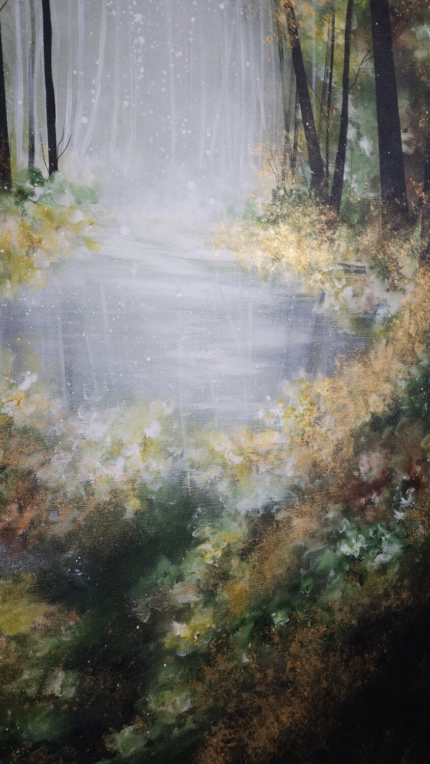 In diesem Werk wollte ich den goldenen Moment „Erleuchte meinen Weg“ darstellen. Die dunklen Bäume bilden einen markanten Kontrast zum Lichteinfall aus der Mitte. Die Atmosphäre ist mystisch und zugleich friedvoll und weckt ein tiefes Gefühl der Hoffnung. Ich habe kräftige Farben und starke Kontraste verwendet, um dieses emotionale Erlebnis zu verstärken. Gold und glänzender Lack.