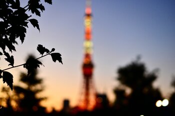 Das warme Leuchten und die weiche Silhouette des Tokyo Tower tauchen sanft auf und stehen wie ein stiller Wegweiser in der zarten Mehrdeutigkeit der Dämmerung.