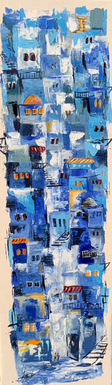 In diesem Werk habe ich kräftige Blautöne mit schnellen, ausdrucksstarken Pinselstrichen übereinandergelegt, um ein Gefühl von Tiefe und Geschichte zu vermitteln. Der halbabstrakte Stil ermöglicht eine fantasievolle Interpretation alter Architekturen, indem er vergangene Reflexionen mit gegenwärtigen Energien vermischt. Mit jedem Strich wollte ich nicht nur das visuelle Spektakel einfangen, sondern auch die Essenz bleibender Erinnerungen und Momente.… Dieses Gemälde lädt den Betrachter ein, seine eigene Geschichte zu weben und verleiht jedem Raum eine inspirierende und dynamische Präsenz.