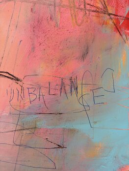 In „Unbalanced“ bewege ich mich im Spannungsfeld zwischen Kontrolle und Intuition. Ich baue die Oberfläche aus Schichten von Acryl und Sand auf und unterbreche sie dann mit Strichen, die Zögern, Korrekturen und plötzliche Richtungswechsel dokumentieren. Das Gemälde entsteht durch Spannung – zwischen Ordnung und Unordnung, Struktur und Impuls. Die Komposition widersetzt sich Symmetrie und Auflösung. Farben prallen aufeinander, Texturen entstehen und… verfallen, und die Linien zeichnen einen Prozess ständiger Anpassung nach, anstatt eine endgültige Antwort zu liefern. Anstatt nach Harmonie zu suchen, betrachte ich das Ungleichgewicht als aktiven Zustand – einen Zustand, der Bewegung, Verletzlichkeit und Transformation ermöglicht.