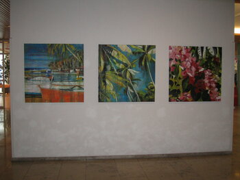 Wenn Sie in den Tropen reisen, gibt es überall und in allen Farben Bougainvilleas. Es ist Teil der herrlichen Landschaft, es ist auf den Philippinen auf einer kleinen Insel im Süden, wo mich die roten Bougainvilleas mit Bananenbäumen im Hintergrund schrecklich angezogen haben, ich musste sie nur malen, keine Chance, ihnen zu entkommen, hey, " Big Red Fall "wurde geboren, es sieht aus wie eine Kaskade von Bougainvillea, von roten Blumen. Erhabene… Schönheit.