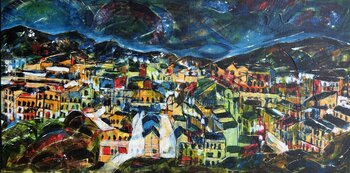 Dieses Gemälde fängt den Zauber einer Nacht in Tusa ein, als das ganze Dorf, an der Küste unweit von Cefalù gelegen, von Gesang zu vibrieren schien. Unter dem Sternenhimmel schimmern die Farben – Blau-, Gold- und Violetttöne, Gelb-, Rot- und Grüntöne verschmelzen in einem Rhythmus aus Licht und Klang. Die abstrakten Formen der Häuser scheinen von Musik zu pulsieren, als sängen die Wände selbst. Eine traumhafte Beschwörung der Freude, des Miteinanders… und der Seele des nächtlichen Siziliens.