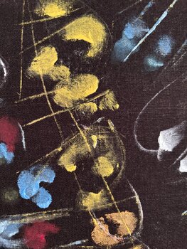 Dieses in Öl auf leuchtendem Stoff gemalte Werk weckt Erinnerungen durch eine Abfolge von Zeichen, Rhythmen und Farben. Die wiederholten, fast musikalischen Pinselstriche beschwören die anhaltende Präsenz von Erinnerungen herauf, die trotz Abwesenheit fortbestehen. Das tiefe Schwarz empfängt Ausbrüche von Gelb, Rosa, Blau und Weiß, wie so viele fragmentierte, leuchtende, manchmal dissonante Erinnerungen. Das Leben wird zu einem Raum für einen stillen… Dialog zwischen zwei Geliebten, zu einer zärtlichen Hommage, in der die gemalte Geste die Verbindung über die Zeit hinaus verlängert.
