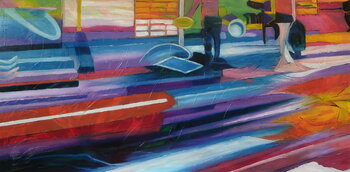 Eine Straßenszene in meiner Nachbarschaft unweit der 5. nördlichen Peripherie von Peking. Eine Frau wirft nach einem Sommersturm Wasser auf die Straße. Ich warte auf den Bus gegenüber und beobachte die Straßenszene. Voller Reflexionen der Gebäude auf der nassen Straße brachte es mich auf die Idee der gegenwärtigen Leinwand, indem ich die Farben multiplizierte.