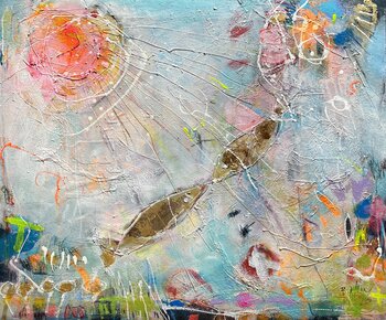 Verliebte Fische Nr. 3 ist ein 65 cm breites x 54 cm hohes und 2 cm tiefes Gemälde auf Leinwand.