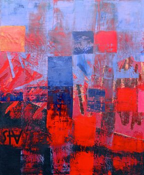 Ein ausdrucksstarkes Bild entwickelt sich stufenweise und über einen längeren Zeitraum. Am Ende vereinen sich verschiedene Einflüsse zu einem unerwarteten Glück. Es ist faszinierend, Fantasie mit Farbe zu beflügeln. Die Landschaft wird abstrakt, wird übermalt, Neues wird eingegliedert in das Alte. Veränderung ist momentaner Stand.