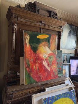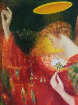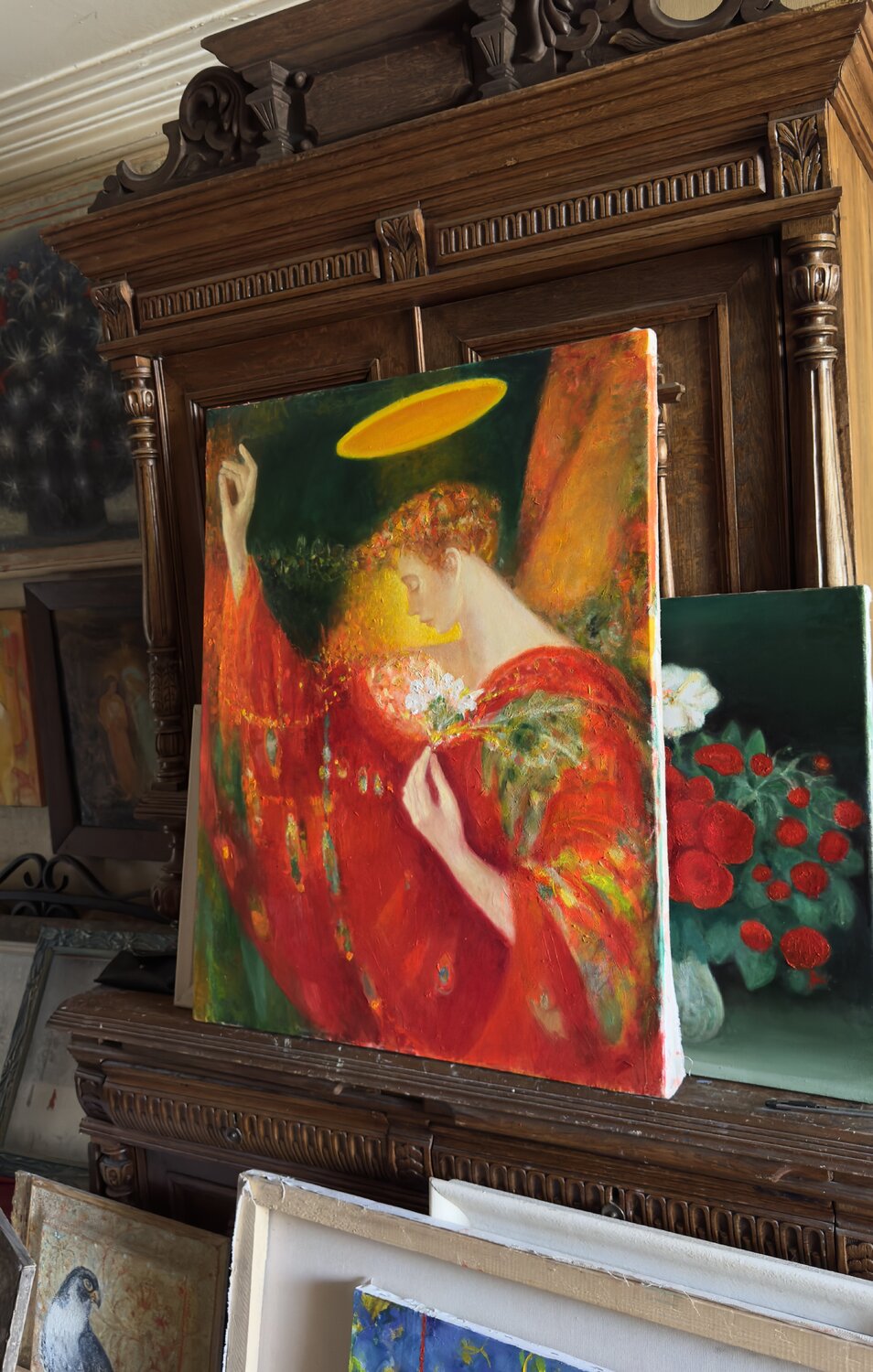 Dieses Gemälde gehört zu Besik Arbolishvilis reifem „Engel“-Zyklus – einem prägenden Werkkomplex, der sich durch starke chromatische Kontraste und eine zeitlose Symbolsprache auszeichnet.