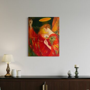 Der rote Engel, gekennzeichnet durch einen goldenen Heiligenschein und eine zurückhaltende Geste, spiegelt den Fokus des Künstlers in seiner Spätphase auf die spirituelle Präsenz anstatt auf die narrative Illustration wider.
