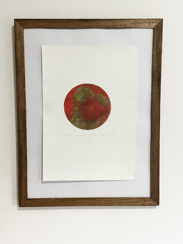 Ich glaube, dass diese Arbeit drei Metaphern materialisiert, die im Selbstporträt verdichtet sind. Nun, der Kreis symbolisiert das Schallloch einer Gitarre und kann auf die Figur von Sergio hinweisen, der Druck symbolisiert meine Spezialität, nämlich das Gravieren, die Textur der Gaze und die Farben verweisen auf den physischen Raum, in dem wir uns trafen, der bekennt: „ „Wir sind Patienten eines kinesiologischen Fitnessstudios.“ Sergio ist seit… einem Jahr dort und ich seit zehn Jahren.