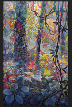 Feyssine Chlorophyll / Gemälde aus der Serie Feyssine. Vorwiegend kühle Töne prägen diese eindrucksvolle Ansicht. Die Gegenlichtbeleuchtung betont die Transparenz des Laubs. Die Kreidetechnik wird anschließend mit Acrylfarben verfeinert, um optimale Farbbrillanz zu erzielen. Das stark strukturierte Gemälde erzeugt eine Oberfläche, die an bestickten Stoff erinnert. Alle Werke dieser Serie entstehen im Herbst in unberührten Waldgebieten. Magische Wälder… werden erschaffen und in die Fantasie des Betrachters entführt. Angezogen von den schimmernden Farben, wahrt der Betrachter zunächst Distanz zu dieser wilden und strukturierten Vegetation, bevor er sich in Kontemplation verliert und diese Alchemie hautnah erlebt. Das Auge wird so mit den unendlichen Kombinationen warmer und kühler Töne konfrontiert. In einem für diese Größe geeigneten Interieur ist eine wahrhaft botanische Wirkung garantiert.