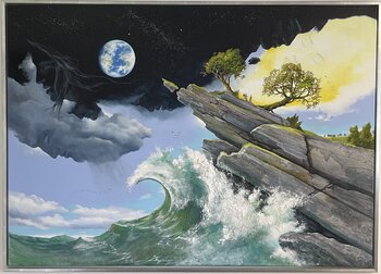 Seit den achtziger Jahren wurde immer wieder darüber geschrieben, dass die Pole schmelzen und der Meeresspiegel steige. So kam es, dass ich dieses Motiv entwarf. Lange habe ich zwischen Nord und Ostsee gelebt und dort die Situation des aufprallenden Meeres bewundert. Die Felsen schützen das Land. Ein Hoffnung zumindest, dass es in der Zukunft so sein wird. Das Bild entstand mit Acrymalerei und meiner speziellen Modeliertechnik, die einen gewissen… 3D Effekt entstehen lässt. Der eine grosse Fels zeigt auf unseren Planeten, der ziemlich einsam in diesem Teil des Universums im Nichts hängt. Es wäre tatsächlich sehr sinnvoll unseren Planeten besser zu behandeln.