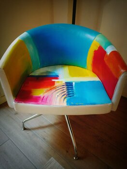 Ein leicht poppiger Sessel mit tausend Farben, die uns drehen und umhüllen, der uns einlädt, innezuhalten, einen Moment zu sitzen und die Freude an einem Moment der Entspannung und Ruhe in einem farbenfrohen Design zu genießen, das uns mit positiver Energie auflädt.