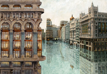 Ikonische Gebäude, Straßen und Plätze, die viele kennen, versinken in den Fluten. Sie werden zum Spiegel unserer Fehler, zur… stillen Warnung, dass die Welt, die wir geschaffen haben, langsam unter uns zerfällt. Die berühmte Gran Vía hat sich gewandelt, ihr Asphalt ist dem Wasser gewichen. Was einst Fortschritt symbolisierte, spiegelt nun Unsicherheit wider, eine Stadt, die in ihrer eigenen Stille versunken ist.