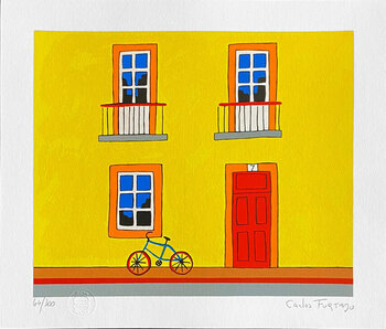 In diesem Druck habe ich ein Stück alltäglicher Gelassenheit mit lebendiger Schlichtheit eingefangen. Die leuchtend gelbe Fassade verkörpert Wärme und fröhliche Energie, im starken Kontrast dazu die kräftige rote Tür und die malerischen Fenster, die ein Gefühl einladender Offenheit vermitteln. Ein einsames Fahrrad lässt auf eine unterbrochene Reise oder einen Besucher schließen und fügt eine Erzählung von Bewegung und Geschichte hinzu. Es wurde entworfen,… um Positivität und einen Hauch von Geheimnis auszustrahlen, und ist ein Stück, das jeden Wohnraum mit Vorfreude und sonniger Stimmung belebt.