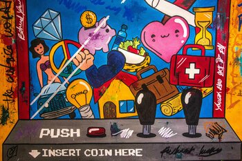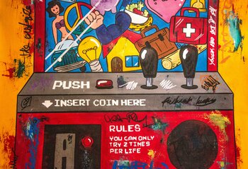 Dieses Gemälde der Arcade-Maschine enthält eine tiefgreifende Botschaft über das Leben und ihre Preise als Lebensziele, darüber, wie der Mensch seine Entscheidungen aufgrund der Lebenserfahrung handhabt. Sie werden mit Sicherheit immer 100% gewinnen und die Regeln lauten, dass Sie es in Ihrem Leben nur zweimal versuchen können. Sie müssen also mit Bedacht auswählen, was Sie sich wünschen. Sie könnten Geld haben, aber keine Familie, oder Sie können… beides haben, aber keine Gesundheit, also ist es wirklich sehr interessant, der Benutzer wird basierend auf seinen Lebenserwartungen wählen, vielleicht hat er eine Behinderung und wünscht sich von allen Dingen auf der Welt, zurück zu sein mit der Gesundheit. Es gibt ein Zucken, das in das Kunstwerk gemalte Graffiti repräsentiert die Außenwelt, die Ereignisse, die Sie im Leben nicht kontrollieren können, wie Unfälle, Naturkatastrophen, Pandemien oder vielleicht eine Panne des Systems, und Sie haben mehr Münzen, mehr Versuche. . das ist das echte Leben.