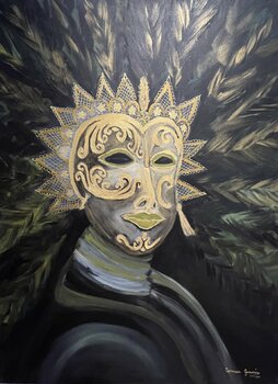 In diesem fesselnden Stück habe ich meine ganze Seele in die Schaffung einer abstrakten Vision von Geheimnis und Feier gesteckt. Die Maske, ein zentrales Symbol, verkörpert das Rätsel der Identitäten, die sich hinter einer Fassade verbergen, und spricht von der universellen Intrige der Selbstfindung und gesellschaftlichen Rollen. Die Acrylstriche vermitteln Bewegung und suggerieren einen Tanz aus Schatten und Licht. Seine Präsenz im Raum soll Fragen… hervorrufen, mit einem Hauch des Unerkennbaren schmücken und zum Nachdenken im Wirbel der ewigen Maskerade des Lebens anregen.