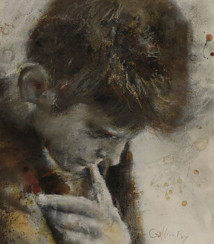 Dieses Porträt zeigt einen Moment des Zweifels und der Unentschlossenheit, einen intimen und wichtigen Moment. Ich wollte eine sehr einfache und reduzierte Farbpalette verwenden, um den Ausdruck in den Mittelpunkt zu rücken. Die verwendeten Materialien waren Öl, Pastell, Bleistift und Graphit. Sie verbinden Realismus mit einer fantasievollen Note und versuchen, diesen zarten inneren Kampf zu vermitteln.