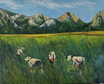 Ich wollte die Schlichtheit und Schönheit der täglichen Feldarbeit einfangen, mit impressionistischen Akzenten, die das sanfte Tageslicht hervorheben. Jeder Pinselstrich drückt die tiefe Verbundenheit zwischen Mensch und Natur aus und lädt Sie ein, den Frieden und die Harmonie dieser Landschaft zu spüren. Dieses Kunstwerk wird Ihrem Zuhause eine warme und lebendige Atmosphäre verleihen.