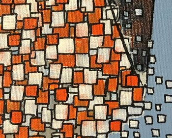 Dieses Gemälde wurde mit quadratischen Pinselstrichen für das Haar und das Kleid gemalt, wobei jedes Quadrat dann schwarz umrandet ist. Quadrate unterschiedlicher Größe. Das Bild löst sich auf oder kommt zusammen. Die Silhouette einer Frau, die auf einem Stuhl mit ihren großen Haaren und ihrem großen Kleid sitzt. So viel Spaß.