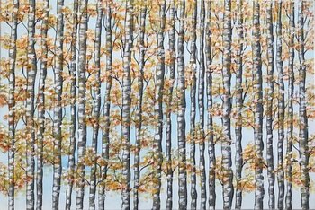 Diese schöne gerahmte Baumlandschaft. Durch die Bäume nach oben schauen, wunderschöne gelbe, orange und weiche grüne Blätter. Die hellen Farben der Baumstämme gegen den blauen Himmel.