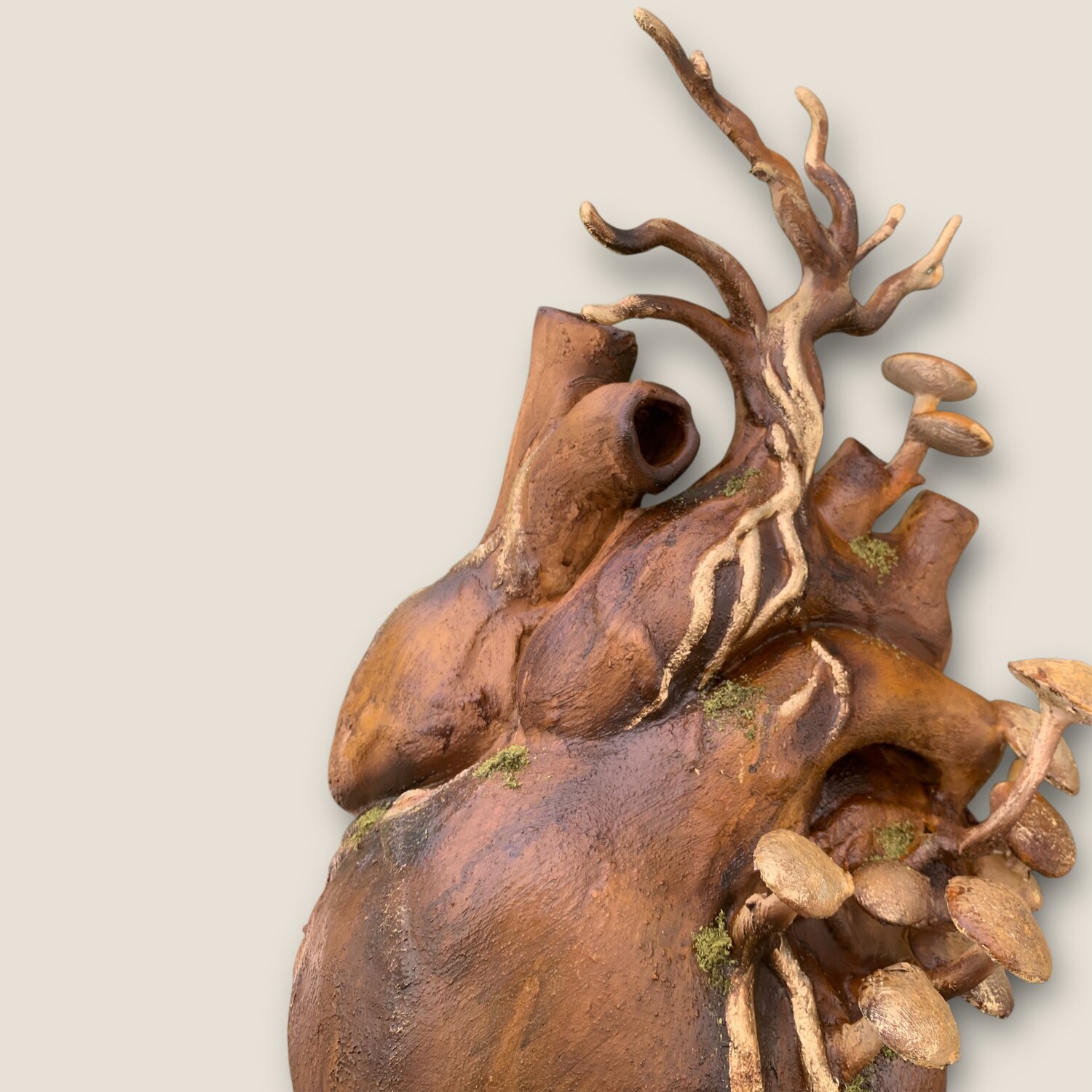 Dieses Herz ist aus vielen Schichten aufgebaut: Farbe über Farbe, durchzogen von goldenem Pigment, das wie ein verborgenes Licht aus der Tiefe aufleuchtet. Kleine Elemente von Kunstwiese lassen die Natur selbst in die Skulptur hineinfließen – ein organisches Echo des Waldes.