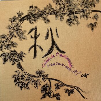 Mit diesem Gemälde wollte ich die sanfte Melancholie einfangen, die ich während der leuchtenden Herbstblüte der Ahornbäume in Japan empfand – jener Zeit, in der sich die Natur auf die Ruhe vorbereitet. Die Tuschestriche und die filzartige Textur erzeugen ein Gefühl von Intimität und Tiefe. Diese Verbindung von figurativen und symbolischen Elementen (chinesische Kalligrafie) lädt zur Meditation ein und verleiht Ihrem Zuhause eine friedvolle und geheimnisvolle… Aura, wie ein nostalgischer und zugleich wohltuender Atemzug.