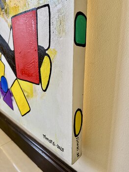 Chromatische Harmonie in Bewegung – diese Komposition pulsiert vor Energie und emotionaler Resonanz. Eine visuelle Studie und eine Einladung, über das Statische hinauszublicken und sich auf den sich ständig verändernden Dialog der Farben einzulassen. Die darunterliegenden Schichten abstrakter Ölfarbe wurden trocknen gelassen, bevor strategisch verteilte geometrische Formen aufgetragen wurden. Markante, sich überlappende Formen erzeugen einen rhythmischen,… energiegeladenen visuellen Fluss. Dieses Kunstwerk vermittelt den Eindruck räumlicher Beziehungen – es reicht von der gegenstandslosen Komposition bis hin zu abstrakten Symbolen durch Geometrie und das Zusammenspiel kräftiger Farben.
