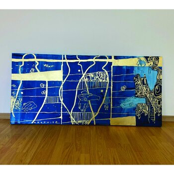 In diesem Werk wollte ich das Zusammenspiel geometrischer Formen und abstrakter Figuren einfangen und dabei die lebendige Energie von Gold vor einem tiefblauen Hintergrund nutzen. Die Kombination aus Acryl und Ölpastell erzeugt einen visuellen Tanz, der zum Nachdenken über die Zukunft und die Harmonie zwischen Ordnung und Chaos anregt. Das Werk bringt Hoffnung und Dynamik in den Raum.