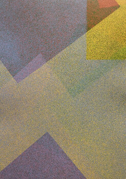 Die schrägen geometrischen Formen teilen den Raum nicht; sie gehen sanft ineinander über und gleiten über ihre Grenzen hinweg. An den Rändern berühren sich die Farben in einem leisen Rauschen und schaffen so Distanz und Kontinuität zugleich. Gelb dehnt sich aus wie Licht in Bewegung und trägt Wärme nach außen, während gedämpfte Violett- und Rosatöne sich nach innen zurückziehen und eine stille Resonanz hinterlassen.