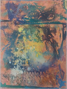 Die Komposition wirkt wie eine Momentaufnahme… eines natürlichen Entstehungsprozesses – zwischen Erosion, Wachstum und Auflösung. Die zufallsbedingten Spuren, Spritzer und Texturen verleihen dem Bild eine starke Materialität und Dynamik. Trotz der Abstraktion entsteht eine assoziative Landschaft, die zwischen Makrokosmos (Erdoberfläche) und Mikrokosmos (Zellstruktur) oszilliert.