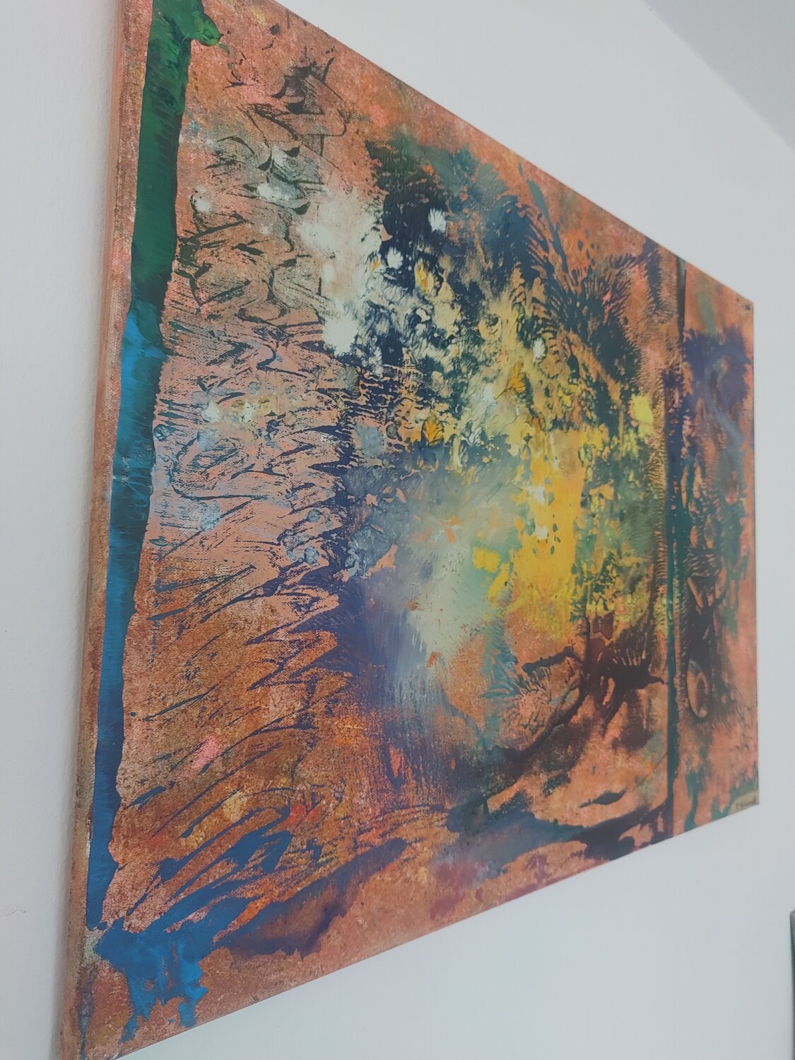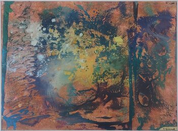Das abstrakte Werk zeigt eine organisch anmutende Bildlandschaft aus ineinanderfließenden Farbflächen. Erdfarbene Töne in Ocker, Rost und Braun bilden den Grundraum, aus dem sich explosionsartig Blau-, Türkis- und Gelbnuancen entwickeln. Durch fließende, verlaufende und teilweise abgepresste Strukturen entstehen Formen, die an geologische Prozesse, Vegetation oder mikroskopische Lebensformen erinnern.