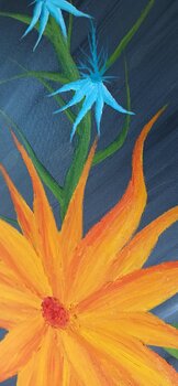 In diesem Werk vereine ich naive Kunst und Surrealismus mit Ölfarben, um eine lebendige und emotionale Szenerie zu schaffen. Die prächtigen orangefarbenen Blumen strahlen eine warme, lebensbejahende Energie aus. Diese Komposition lädt dazu ein, seinen tiefsten Träumen und Wünschen nachzuspüren und den Alltag für einen Moment hinter sich zu lassen. Dieses Gemälde soll in jedem Raum, in dem es hängt, eine Atmosphäre der Inspiration und des Staunens… schaffen.