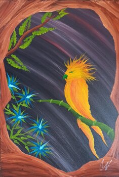 In diesem Gemälde kommt meine tiefe Leidenschaft für die Natur und ihre mystischen Kreaturen zum Ausdruck. Die leuchtenden Töne und das naiv-überschwängliche Spiel mit Formen erwecken den Phönix zum Leben, ein Symbol der Erneuerung und der unendlichen Energie. Mit Ölfarben formte ich jede Feder, um Hoffnung und Belebung in jeden Raum zu bringen, den dieses Kunstwerk ziert.