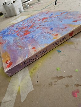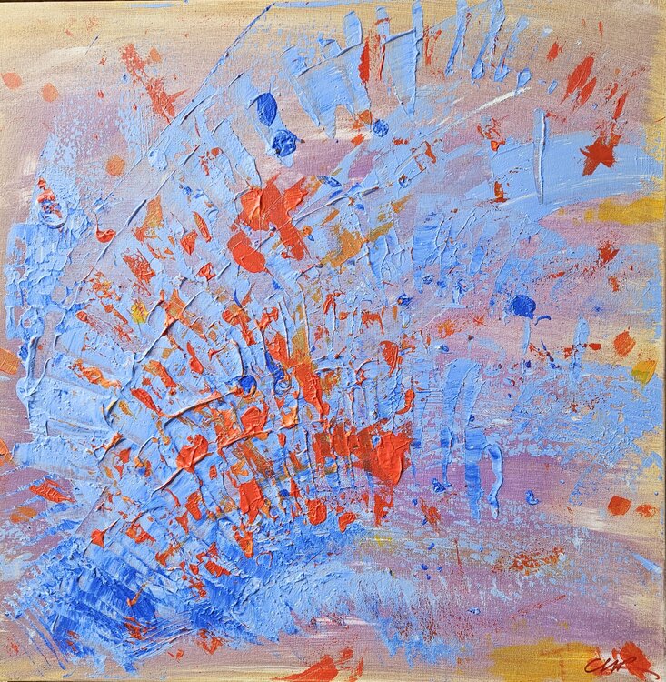 In diesem Werk habe ich meine Energie in einen lebendigen Kontrast aus Blau und Orange gesteckt und einen Moment dynamischer Bewegung und purer Emotionen eingefangen. Mit Acrylfarben habe ich kräftige Striche und strukturierte Spritzer übereinandergelegt, um ein Gefühl rastloser Kreativität und Leidenschaft zu erzeugen. Dieses Kunstwerk wird Ihren Raum mit einem energetischen Puls erfüllen und Sie dazu inspirieren, mutig zu sein und Ihren Impulsen… ohne Zögern zu folgen. Folgen Sie Ihrem Herzen – Sie werden frei sein – es wird Sie in den Himmel führen