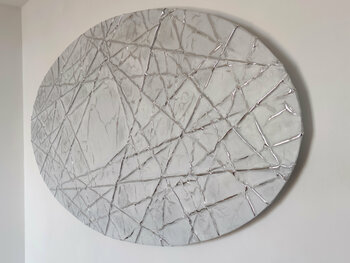 Abstrakt, zeitlos modern - im Spannungsfeld zwischen Bild und Skulptur. Ein Anfangs scheinbar geometrisch aufgebautes Relief aus Linien geht zunehmend in eine Landschaft aus unberechenbaren Verwerfungen über. Die große, leicht gewölbte Ellipse bildet durch die zarten Ränder einen eleganten, schwebenden Körper, der dieser Oszillation zwischen Ordnung und Chaos, urbanem Raum und Natur, Bild und Skulptur raumgreifend Wirkung verleiht. Die helle Tusche… und die blankpolierten metallischen Strukturen schaffen eine in sich ruhende und aus sich kommende Stimmung, die sich in jedes Interieur fügt, die jeweilige Lichtsituation aufnimmt und verstärkt.