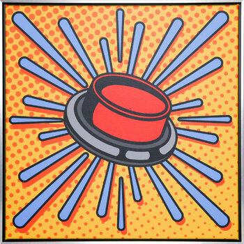 Press to see… ist ein kühnes und verspieltes Gemälde, das den schelmischen und interaktiven Geist der Play with me…-Serie verkörpert. Dieses Werk verfügt über einen leuchtend roten Knopf, umgeben von einem explosiven blauen Muster und einem leuchtend gelben Hintergrund, unterbrochen von mehreren orangefarbenen Punkten.