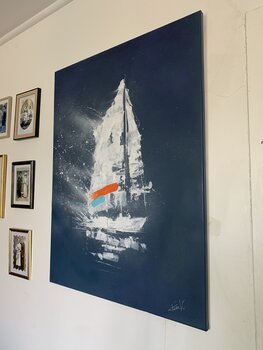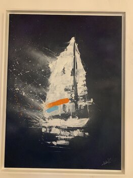 Hier ist ein Segelboot zwischen Himmel und Meer verloren. Der Kontrast zwischen den weißen Blitzen und dem dunklen Hintergrund unterstreicht die Spannung zwischen Ruhe und Bewegung. Die leuchtenden Farben durchziehen die Nacht und zerreißen ihre Tiefe, symbolisiert durch den Einsatz der Sprühdose.