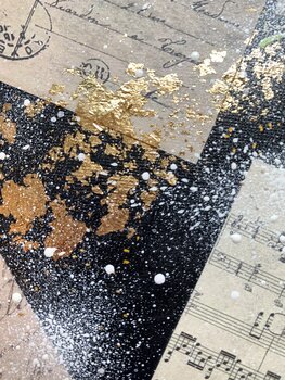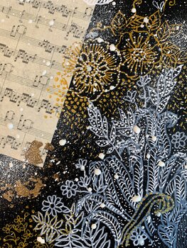 Eine kleine Mixed-Media-Leinwand, die die Feinheit von Zeichnungen mit Acrylstiften mit Collagen von Texten in antiker Schrift auf einem nachtblauen Hintergrund mit Streifen aus Vergoldung und Sternenlicht kombiniert. Ein Tagtraum, in dem die Kreativität vom Instinkt getragen wird.