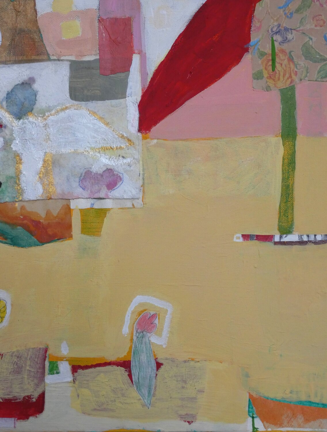 Im Vordergrund auf der rechten Seite dominiert ein großer, anmutiger Papagei - die eigene Assoziation -, dessen kräftiger, schnabelähnlicher Kopf, fast die gesamte Bildhälfte einnimmt. Seine Präsenz wirkt majestätisch und zugleich gemeimnisvoll, als trüge er eine verborgene Botschaft in sich. Links neben ihm formen sanfte Pastelltöne abstrakte Gebilde, die wie ein Kissen erscheinen, auf dem der Engel sichtbar wird. Der Vogel spricht nicht, er erinnert;… der Engel antwortet nicht, er leuchtet. Zwischen beiden entsteht ein Moment, der wie ein Vers klingt: seltsam tröstlich, voller Fragen, die keine Antwort verlagen. Das Bild hält den Augenblick fest, in dem das Alltägliche auf das Übernatürliche trifft und Sprache zu Vision verwandelt.