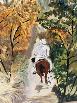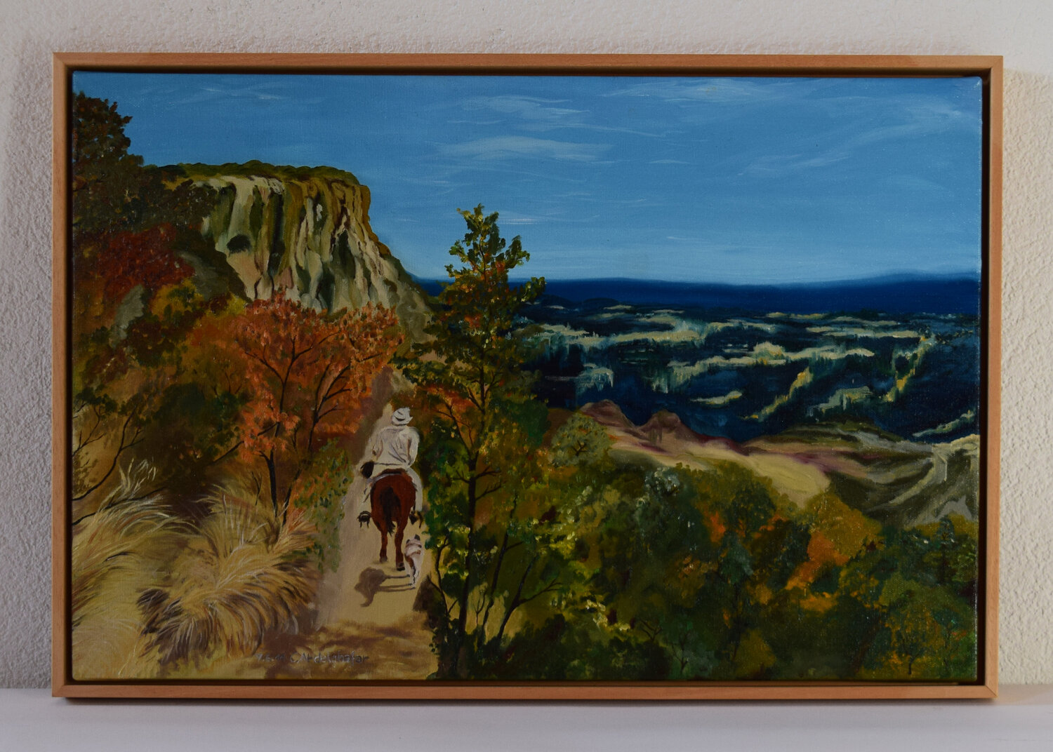 Dieses Ölgemälde zeigt die beeindruckende Landschaft der Sierra Tara Humara in Mexico mit einem einsamen Reiter und seinem Hund auf einem schmalen Pfad. Die Landschaft ist dramatisch und vielfältig. Auf der linken Seite ragt eine massive Felswand empor, deren steile Klippen in warmen Erdtönen gemalt sind. Die Vegetation ist üppig und herbstlich, mit Bäumen und Büschen in Grün-, Gelb- und Orangetönen, die die Szene beleben. Rechts öffnet sich ein… weiter Blick in eine Ebene. Die Fernsicht zeigt eine abwechslungsreiche Landschaft mit sanften Hügeln, Wäldern und offenen Flächen, die sich bis zum Horizont erstrecken. Der Himmel ist in einem klaren, hellen Blau gehalten, mit einigen zarten Wolkenstreifen. Besonders die Vegetation und die felsigen Strukturen sind detailliert ausgearbeitet. Insgesamt vermittelt das Bild eine Atmosphäre von Freiheit, Abenteuer und der Weite der Natur.