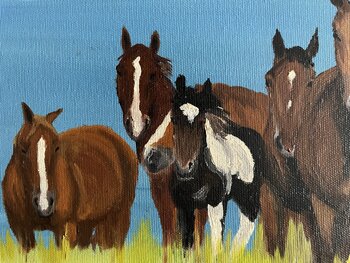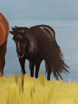Dieses stimmungsvolle Ölgemälde fängt die Essenz der Freiheit und Natürlichkeit einer Pferdeherde auf einer weiten Sommerweide ein. Die Pferde stehen dicht beieinander auf einer saftigen, gelbgrünen Wiese, die den Vordergrund des Bildes dominiert. Das leuchtende Grün des Grases bildet einen lebendigen Kontrast zum intensiven Blau des Himmels und unterstreicht die Wärme und Üppigkeit der Sommerlandschaft. Besonders beeindruckend ist die Detailgenauigkeit,… mit der die einzelnen Pferde porträtiert wurden. Die zentrale Figur, ein kräftiges braunes Pferd, scheint den Betrachter direkt anzublicken und schafft so eine unmittelbare Verbindung zum Publikum. Die horizontale Anordnung der Pferde und die klare Aufteilung zwischen Himmel und Wiese schaffen eine harmonische Balance, die die natürliche Schönheit der Szene unterstreicht. Dieses Gemälde ist eine Hommage an die majestätische Schönheit der Pferde und ihre Verbundenheit mit der Natur.