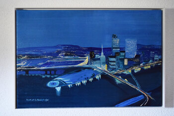 Dieses faszinierende Ölgemälde zeigt die nächtliche Stadtansicht von Pittsburgh in Pennsylvania. Im Vordergrund sieht Fort Bitt Bridge, eine der vielen bekannten Brücken von Pittsburgh. Ihre Lichter spiegeln sich im dunklen Wasser und schaffen eine dynamische Linie, die den Blick in die Komposition führt. Die Skyline der Stadt erhebt sich majestätisch im Hintergrund. Wolkenkratzer mit erleuchteten Fenstern ragen in den Nachthimmel, wobei zwei besonders… hohe Gebäude die Silhouette dominieren. Die Farbgebung des Gemäldes ist überwiegend in verschiedenen Blautönen gehalten, von tiefen Marineblau bis zu leuchtenden Cyan. Gelbe und weiße Lichtpunkte setzen lebendige Akzente und vermitteln die pulsierende Energie der nächtlichen Großstadt. Dieses Werk lädt den Betrachter ein, in eine verträumte, fast surreale Version einer bekannten Stadtlandschaft einzutauchen und regt die Fantasie an, sich vorzustellen, wie die Stadt der Zukunft aussehen könnte.