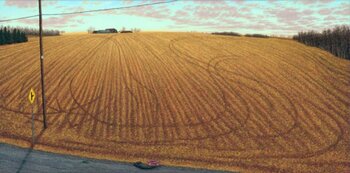 Mit jedem neuen Bild, das herbstlichen Feldern gewidmet ist, wird der Himmel zunehmend auf den oberen Rahmenrand beschränkt, um dem Boden deutlich mehr Bedeutung zu verleihen. Dieses an Abstraktion grenzende Gemälde ruft pure und schlichte Kontemplation hervor. Ein Feld mit geschnittenem Heu nimmt den gesamten Raum ein, und nur ein kleiner Bauernhof oben auf dem Hügel bietet uns eine maßstabsgetreue Perspektive. Da das geschnittene Heu die größte… Herausforderung darstellte, wurde es mit Dutzenden von oft unwirklichen Schattierungen gemalt, sodass jeder Strang aus der Nähe betrachtet wie ein Regenbogen aussah. Eine gewaltige Aufgabe, wenn es je eine gab. Um Monotonie zu vermeiden, erzeugen die Spuren eines Traktors Arabesken, die die Oberfläche des Feldes beleben. Der geschwungene Horizont suggeriert die Krümmung der Erde und rechtfertigt den Titel. Auch die Wolken bilden einen Bogen über dem Bauernhof und heben ihn dadurch hervor. Das Gelb/Orange, das dieses Feld dominiert, scheint im Licht zu strahlen.