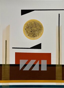 Im Zentrum durchbricht der kreisförmige, materielle Kern die Linearität und wird zum Punkt der Konzentration, zu einem Ort aktiver Stille und Präsenz. Die Farbfelder… – Weiß als Feld der Erwartung, Erdtöne und Tiefrot als Fundament – verankern die Komposition in einer stabilen, kontemplativen Dimension.