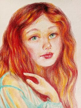 In dieser zarten Darstellung tanzten meine Buntstifte auf dem Papier, um die Gelassenheit einer jungen Muse einzufangen, eingehüllt in die Ruhe des Türkises. Durch den Realismus der bildenden Kunst habe ich ihrem wehmütigen Blick eine gefühlvolle Erzählung verliehen und den Betrachter zu einer nachdenklichen Pause eingeladen. Ihre feurigen Locken kontrastieren mit kühlen Farbtönen und verkörpern eine Harmonie aus Wärme und Ruhe, die jedem Raum einen… Hauch poetischer Eleganz verleihen kann.