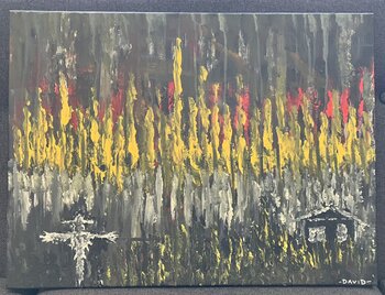 David Coulson, der in Ontario zunächst als Tätowierer bekannt wurde, hat sich in letzter Zeit der Malerei zugewandt und sucht nach einem freien, abstrakten Ansatz, der sich von seiner Tätowiertradition abhebt. Seine Technik ist locker und spontan, mit minimalen Details, wodurch sich jedes Werk unvorhersehbar entwickelt und viel Raum für die Fantasie des Betrachters lässt. Durch eindrucksvolle postapokalyptische Szenen von Ontarios Sümpfen, verlassenen Hütten und Waldbränden regen seine Werke zu tiefgründigen Betrachtungen über die Widerstandsfähigkeit der Natur und die Vergänglichkeit des menschlichen Daseins an.