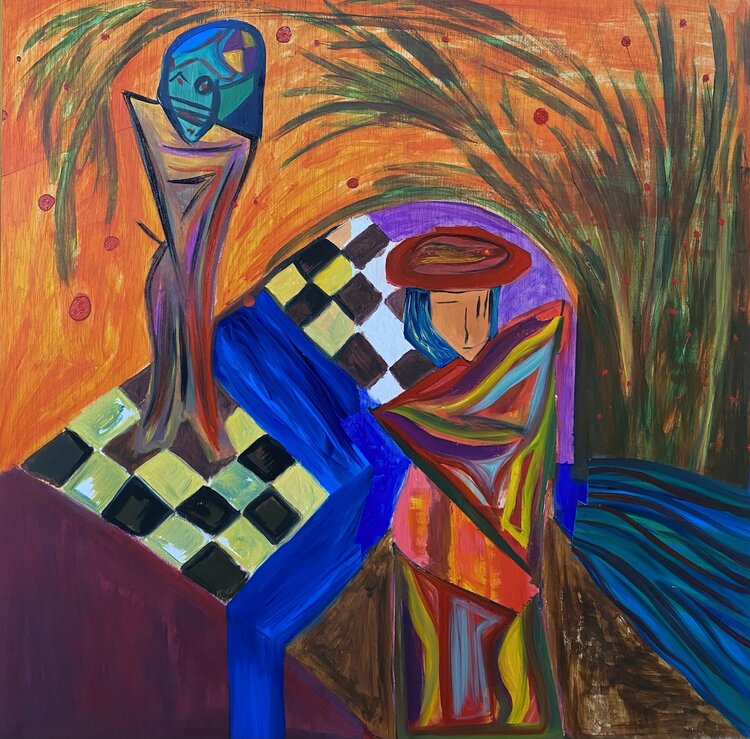 Zwei Figuren im selben Feld – eine feststehend und vertikal, die andere in Bewegung und in Farbe gehüllt. Das Schachbrettmuster zwischen ihnen ist keine Grenze. Es ist die noch zu überwindende Distanz. Das Orange hält alles auf derselben Temperatur: das Warten, die Annäherung, den Moment vor der noch ausstehenden Berührung.