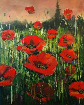 In dieser lebendigen Kreation habe ich meine Emotionen in jeden Strich gesteckt und das Abstrakte mit einem Hauch von Realismus vermischt, um ein lebendiges und pulsierendes Feld hervorzurufen. Die kräftigen roten Mohnblumen stechen als Symbole der Widerstandskraft und Erinnerung hervor und bilden einen Kontrast zur ruhigen Dämmerung im Hintergrund. Es ist ein Stück, das die Wärme eines erhabenen Sonnenuntergangs und die raue Schönheit der Natur… transportiert und perfekt ist, um einen dynamischen, erhebenden Geist in jeden Wohnraum zu bringen.